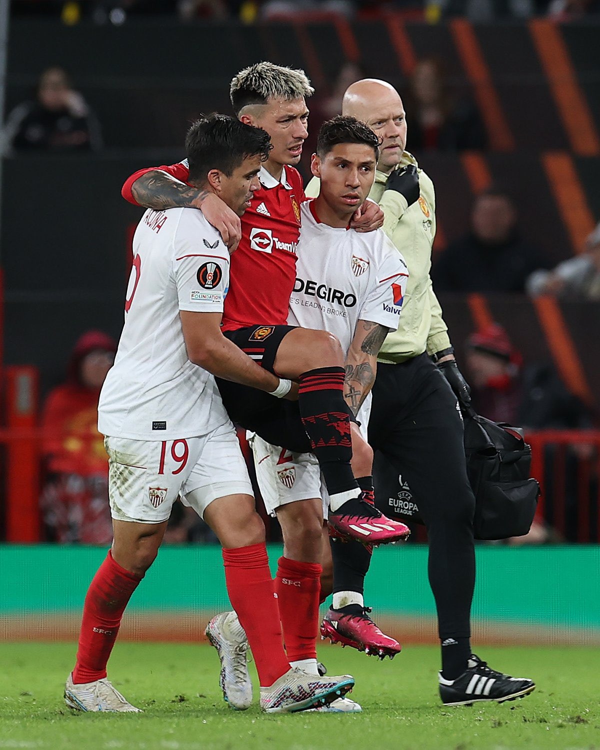 Lisandro Martínez fue cargado por Montiel y Acuña al lesionarse en el Manchester United vs. Sevilla [VIDEO]