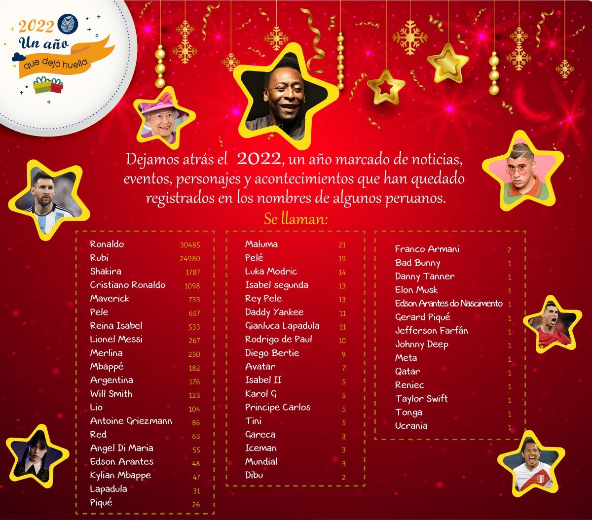 Ronaldo, Pele (sin tilde), Lionel Messi, Mbappé y Lio son los cinco nombres relacionados al fútbol más registrados en el Perú en 2022, según dio a conocer el Registro Nacional de Identificación y Estado Civil (Reniec).