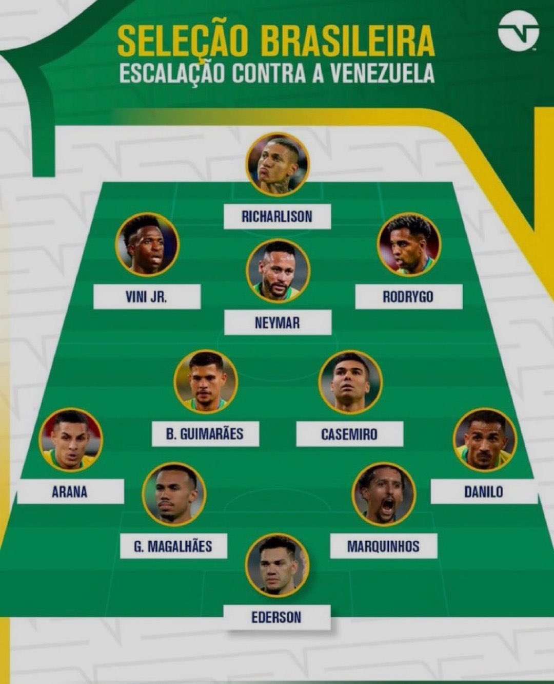 Ederson; Danilo, Marquinhos, Gabriel Magalhaes, Renán Lodi; Bruno Guimaraes, Casimiro, Raphinha, Rodrygo Goes; Neymar Jr y Richarlison.