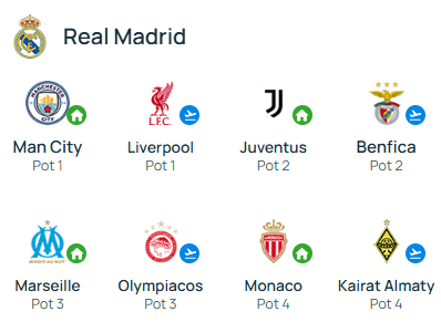 - Bombo 1 : PSG, Real Madrid, Manchester City, Bayern Múnich, Liverpool, Inter de Milán, Chelsea, Borussia Dortmund y FC Barcelona.