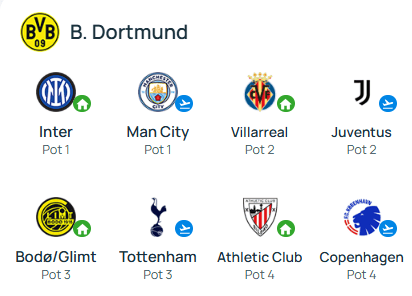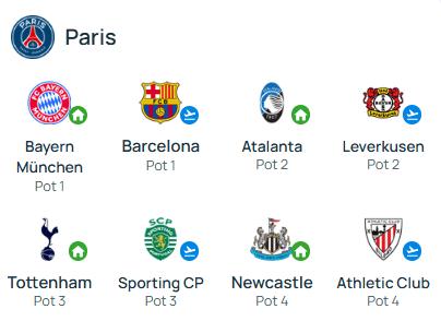 - Bombo 2: Arsenal, Bayer Leverkusen, Atlético de Madrid, Atalanta, Villarreal, Juventus, Eintracht Frankfurt.