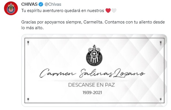 Carmen Salinas era fanática del club Chivas de Guadalajara. Por ello, el equipo azteca se despidió de la actriz con un emotivo mensaje: "Tu espíritu aventurero quedará en nuestros corazones. Gracias por apoyarnos siempre, Carmelita. Contamos con tu aliento desde lo más alto".