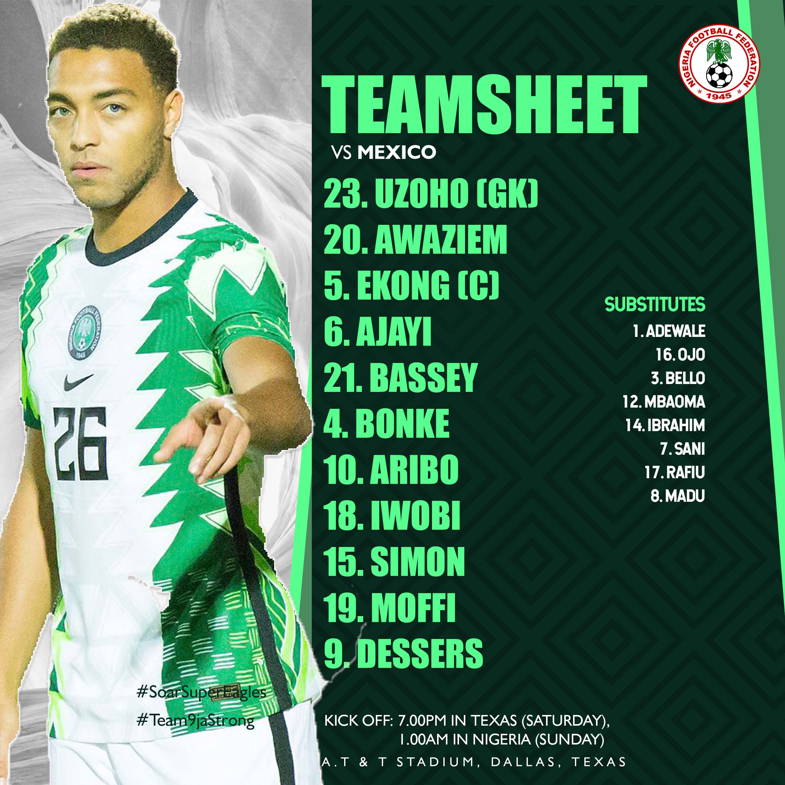 • Uzoho, Awaziem, Ekong, Ajayi, Bassey, Bonke, Aribo, Iwobi, Simon, Moffi, Dessers.