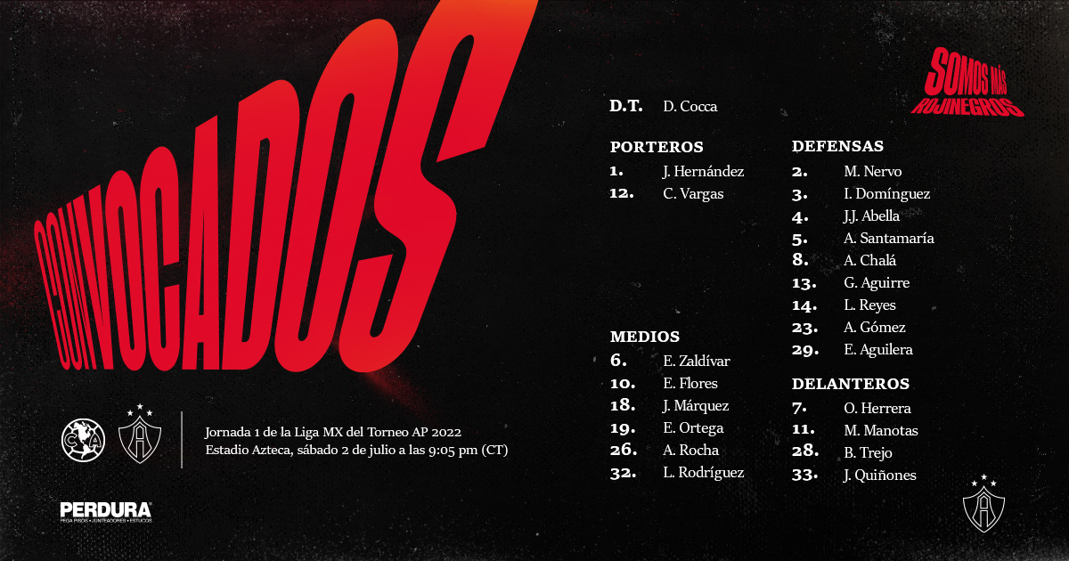 Posible alineación de Atlas: Camilo Vargas; Emmanuel Aguilera, Hugo Nervo, Anderson Santamaría, Aldo Rocha, José Abella, Diego Barbosa, Edgar Zaldívar, Luis Reyes, Julián Quiñones, Jonathan Herrera.
