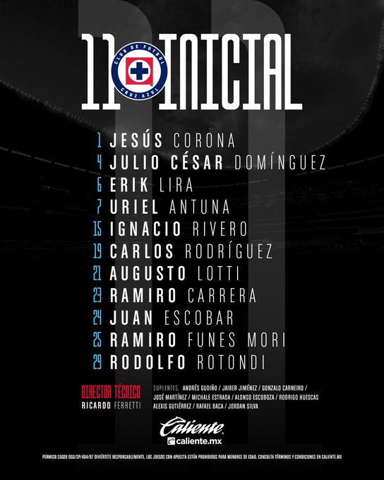 Cruz Azul: J. Corona; J. Escobar, R. Funes, J. Domínguez; J. Martínez, E. Lira, I. Rivero, C. Rotondi; C. Antuna, A. Lotti, C. Rodríguez.