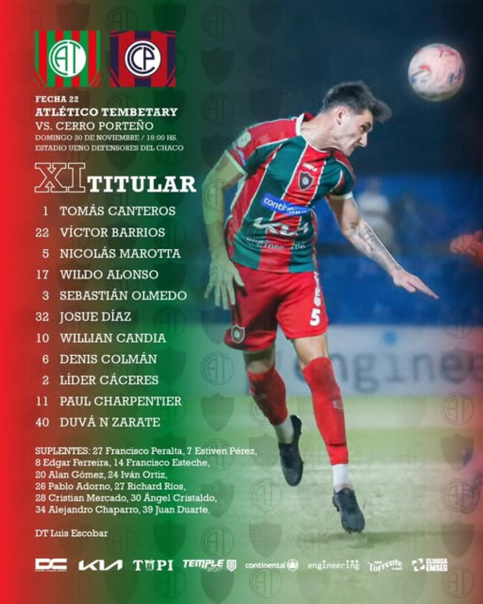 - Posible alineación de Atlético Tembetary: Canteros, Alonso, Olmedo, Marotta, Barrios, Zárate, Lopez, Cristaldo, Colmán, Rojas, Charpentier