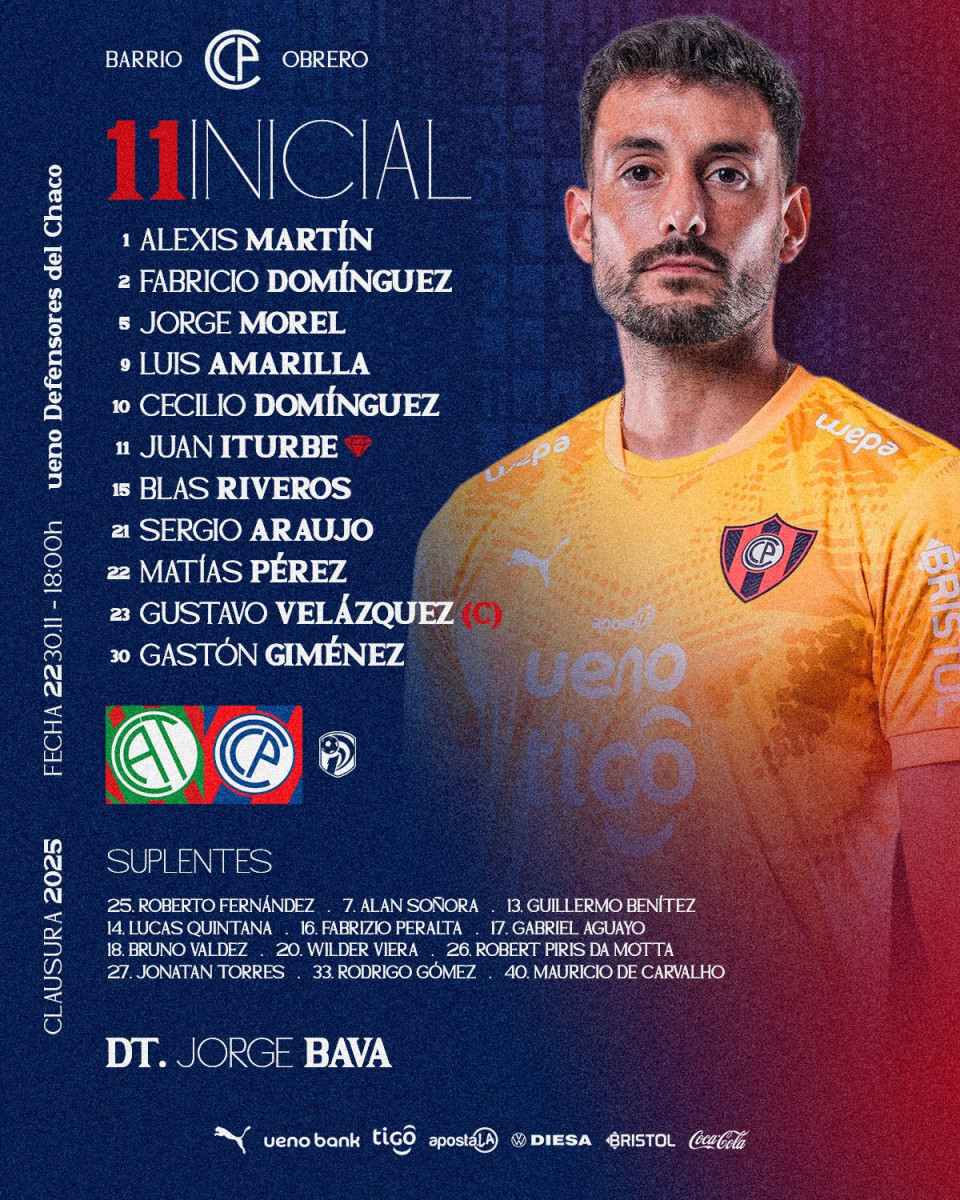 - Posible alineación de Cerro Porteño: Martín Arias, Riveros, Quintana, Velázquez, Gómez, Domínguez, Giménez, Morel, Domínguez, Araújo, Iturbe.