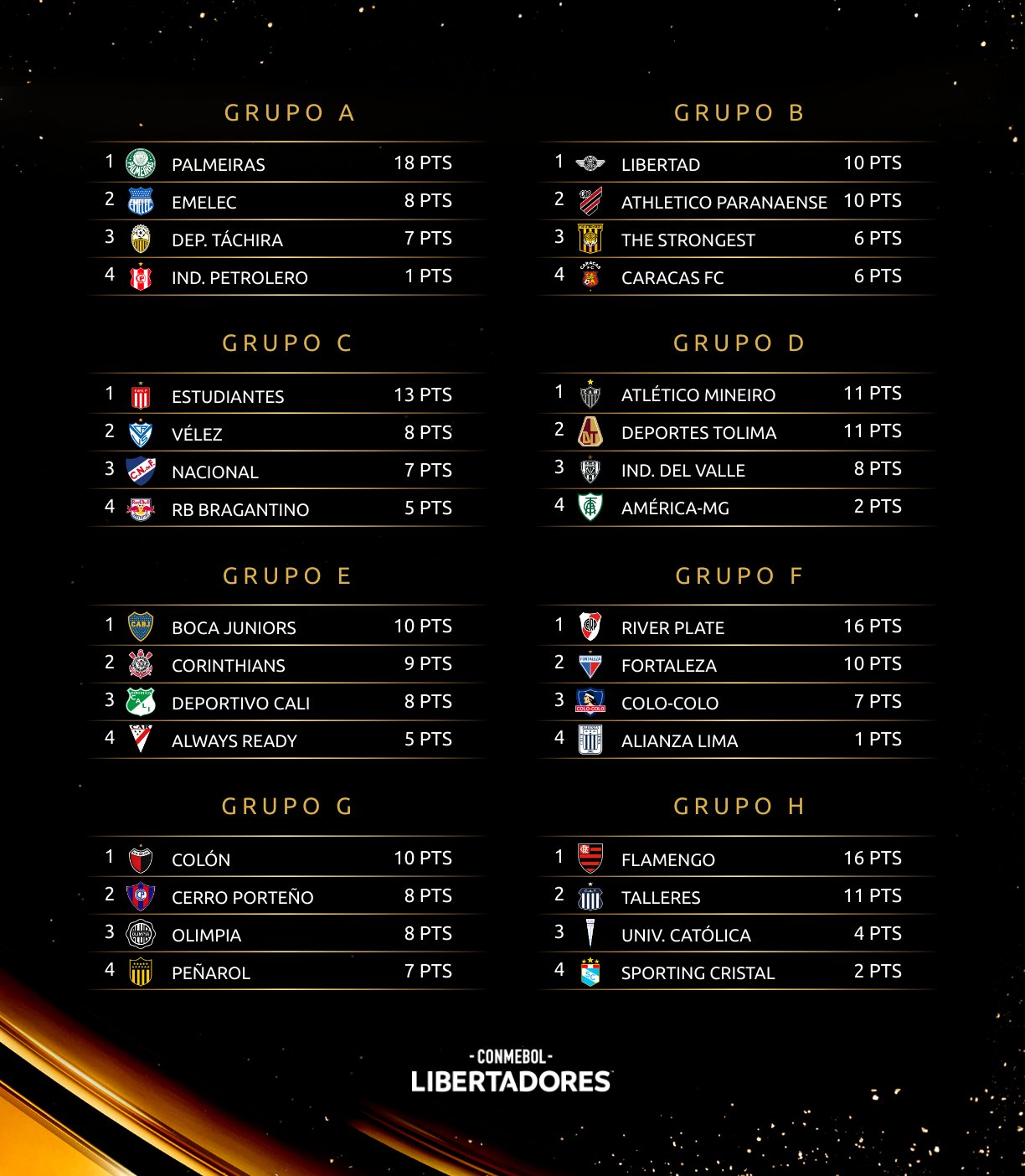 Como se sabía desde un principio, los 2 primeros equipos de cada grupo clasifican a octavos de la CONMEBOL Libertadores, los terceros obtiene un cupo a la Copa Sudamericana y los últimos quedan eliminados del certamen.