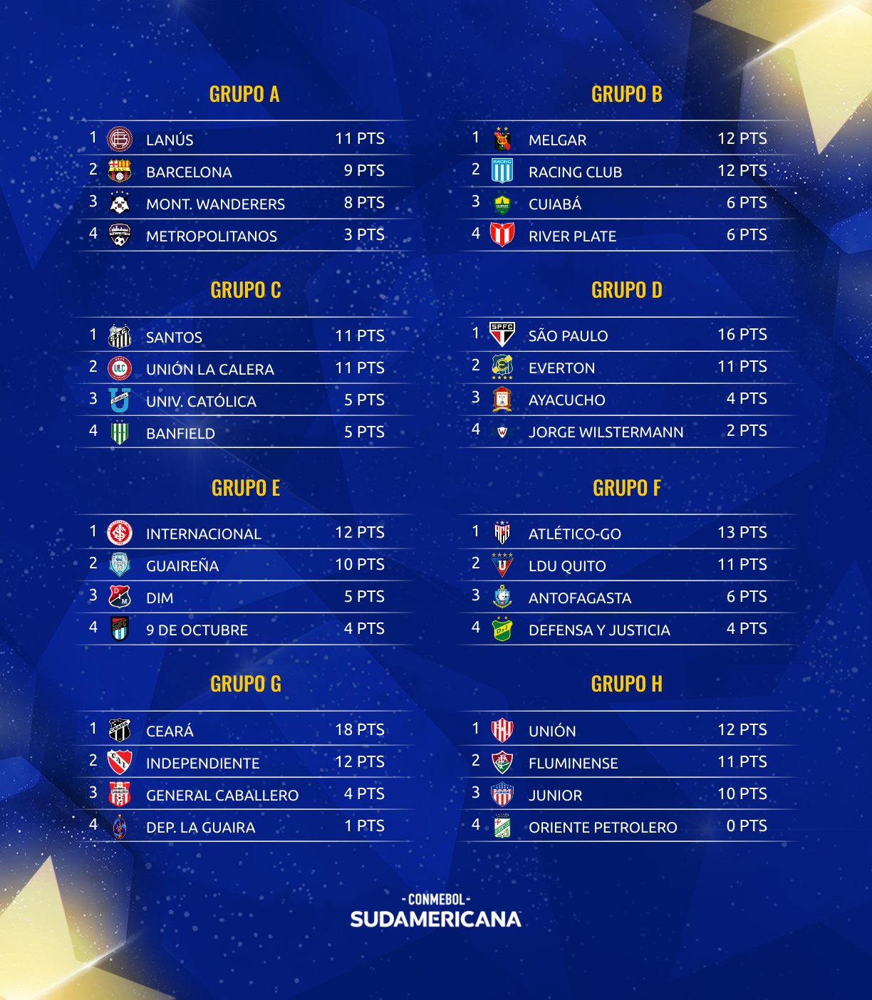Es importante resaltar que en el actual formato de la Copa Sudamericana, solo clasifican los primeros de cada grupo, es decir solo 8 equipos, el cuadro de octavos se completa con los clubes que queden terceros en la CONMEBOL Libertadores.