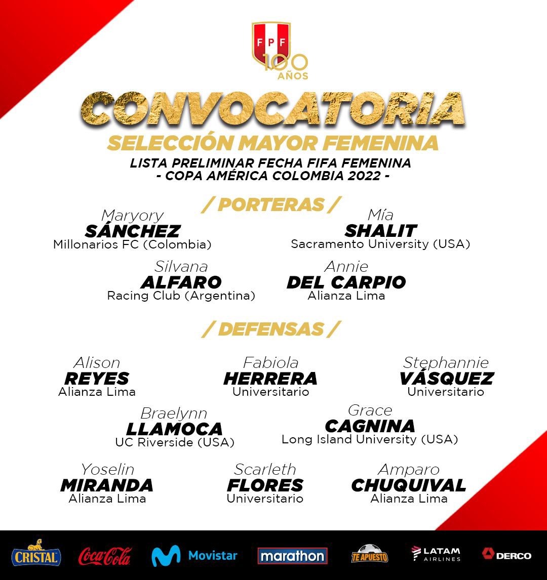 La selección peruana femenina dio a conocer una lista preliminar de convocadas para los amistosos por la Fecha FIFA de finales de junio y de cara a la Copa América, que se disputará del 8 al 30 de julio en Colombia.
