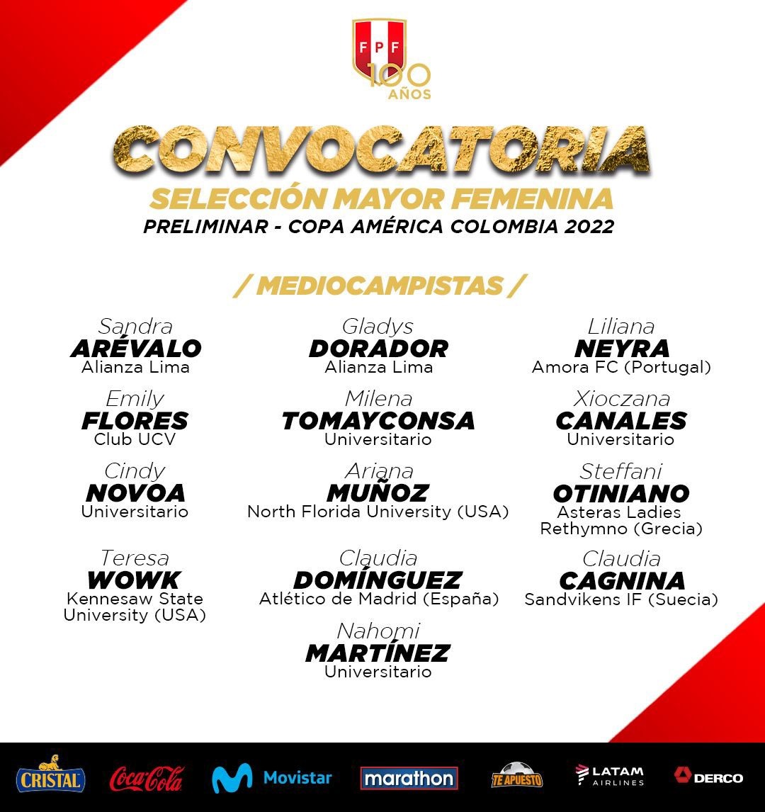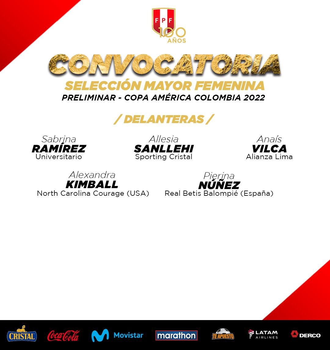 Dentro del llamado destacan los nombres de la arquera Maryory Sánchez (Millonarios FC - Colombia), de la defensa Fabiola Herrera (Universitario), de la mediocampista Gladys Dorador (Alianza Lima) y de la delantera Pierina Núñez (Real Betis - España).