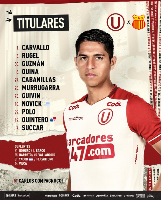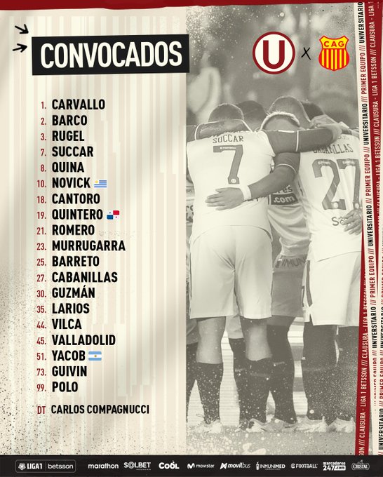 Universitario recuperó a José Carvallo para este choque, luego de que la selección peruana liberara excepcionalmente al ‘1′. También estará Andy Polo, quien estuvo toda esta semana en Videna, pero entró de último momento en la lista para los amistosos en Estados Unidos. No forma parte del equipo Piero Quispe y vuelve Alexander Succar tras cumplir una sanción.