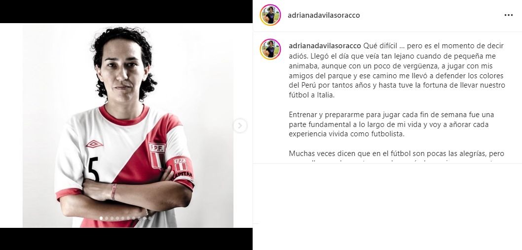 "Qué difícil... pero es el momento de decir adiós. Llegó el día que veía tan lejano cuando de pequeña me animaba, aunque con un poco de vergüenza, a jugar con mis amigos del parque y ese camino me llevó a defender los colores del Perú por tantos años y hasta tuve la fortuna de llevar nuestro fútbol a Italia", inició Dávila.