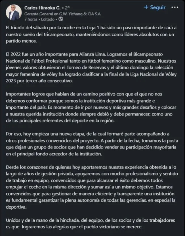 "Hoy empieza una nueva etapa, de la cual formaré parte acompañando a otros profesionales convencidos del proyecto. A partir de la fecha, tomamos la posta que dejan un grupo de socios que han decidido vender su participación mayoritaria en el principal fondo acreedor de la institución", expresó Hiraoka en su cuenta de Linkedin.