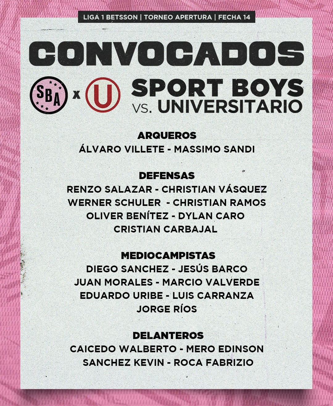 Estos son nuestros convocados para enfrentar a @sportboys por la #Liga1Betsson Apertura.#ConLaUHastaElFinal pic.twitter.com/QkmZKI92YP