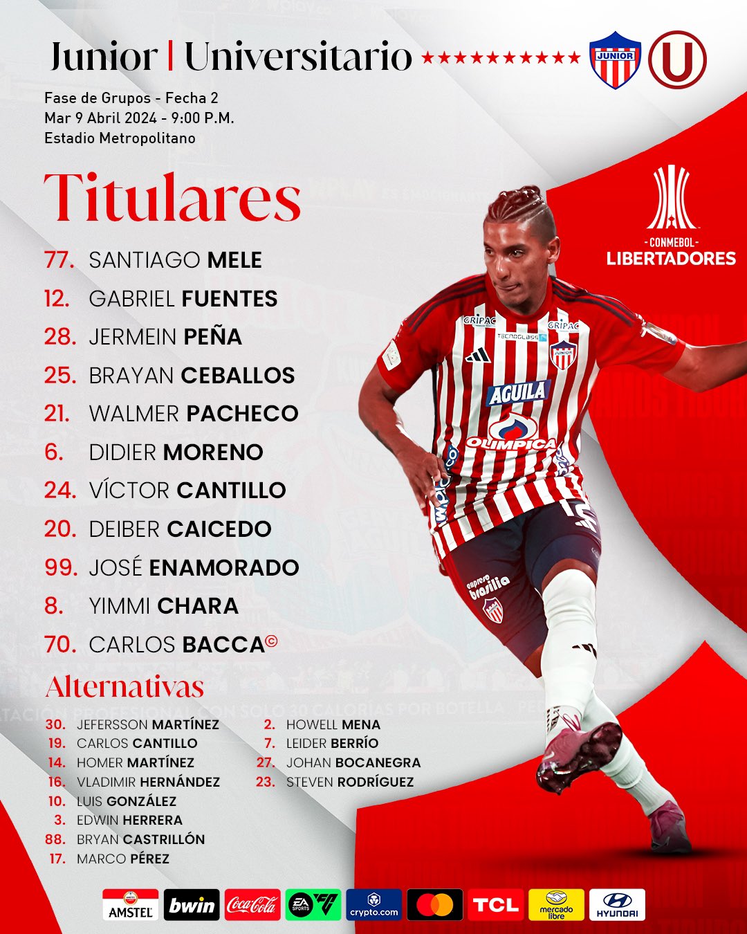 El duelo por la fecha 2 del Grupo D de la Copa CONMEBOL Libertadores entre Universitario vs. Junior de Barranquilla se disputará este martes 9 de abril del 2024 en el estadio Metropolitano Roberto Meléndez.