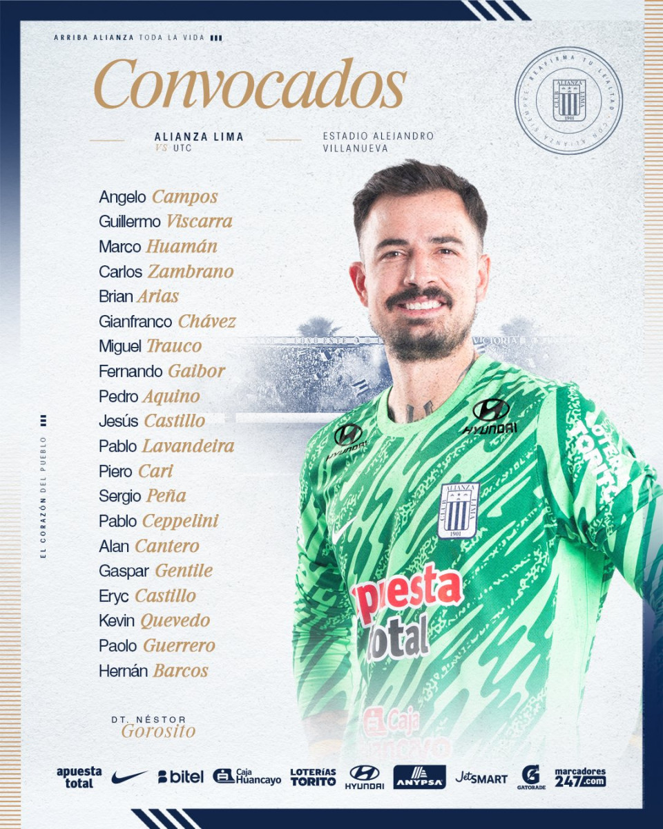 Repasa la lista de convocados que entregó Néstor Gorosito, DT de Alianza Lima, para el partido ante UTC.
