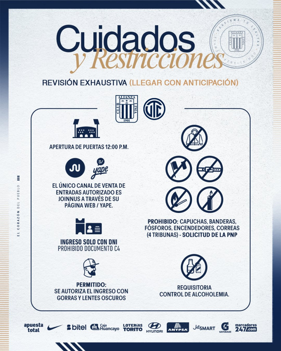 A través de sus canales, Alianza Lima publicó los cuidados y obligaciones que deberán cumplir los asistentes hoy a Matute.